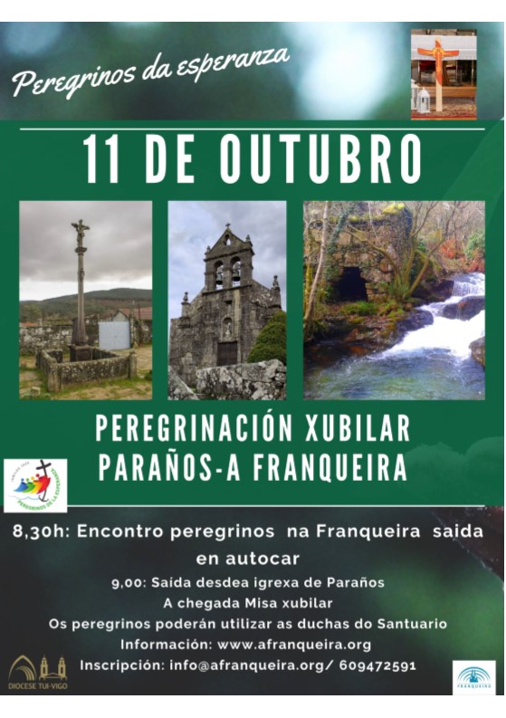 O próximo sábado temos unha nova edición das peregrinacións xubilares a Franqueira. Nesta ocasión sairemos ás 8,30 desde o Santuario en autocar para ir a parroquia de Paraños e iniciar alí o camiño. Anímate a facer connosco este camiño de esperanza. VER DETALLES